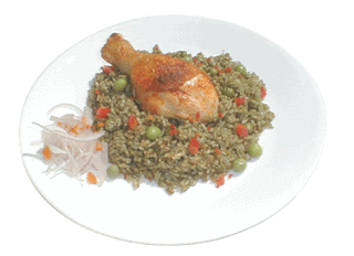Servir el arroz con las presas de pollo bien calientes y decorar con tiras de pimiento.